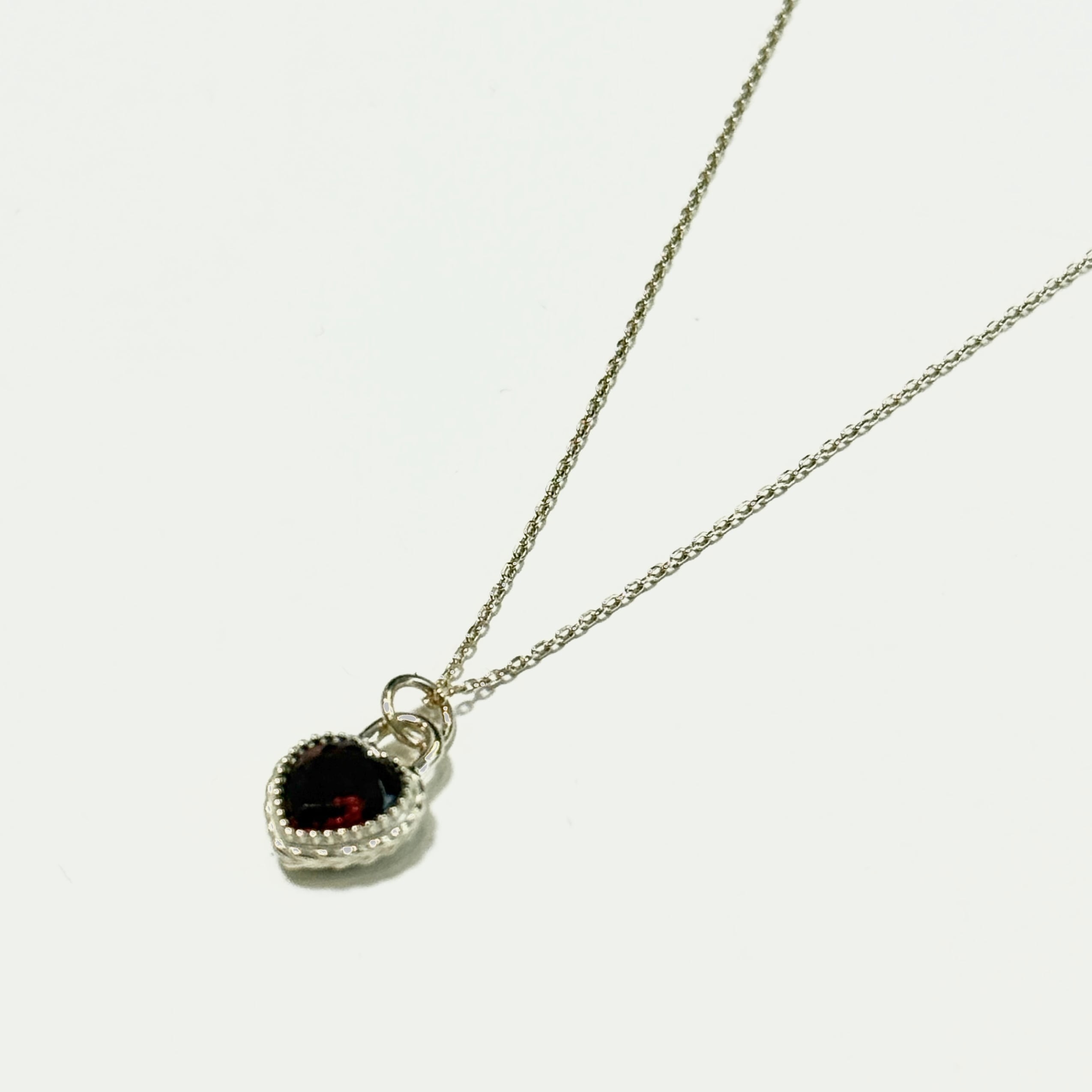 上品に輝く5㎜のハート型天然石をあしらったネックレスはシンプルながらもさりげない存在感があり、どんなスタイルにもマッチします。天然石はガーネットとオニキスの2種類からお選び頂けます。