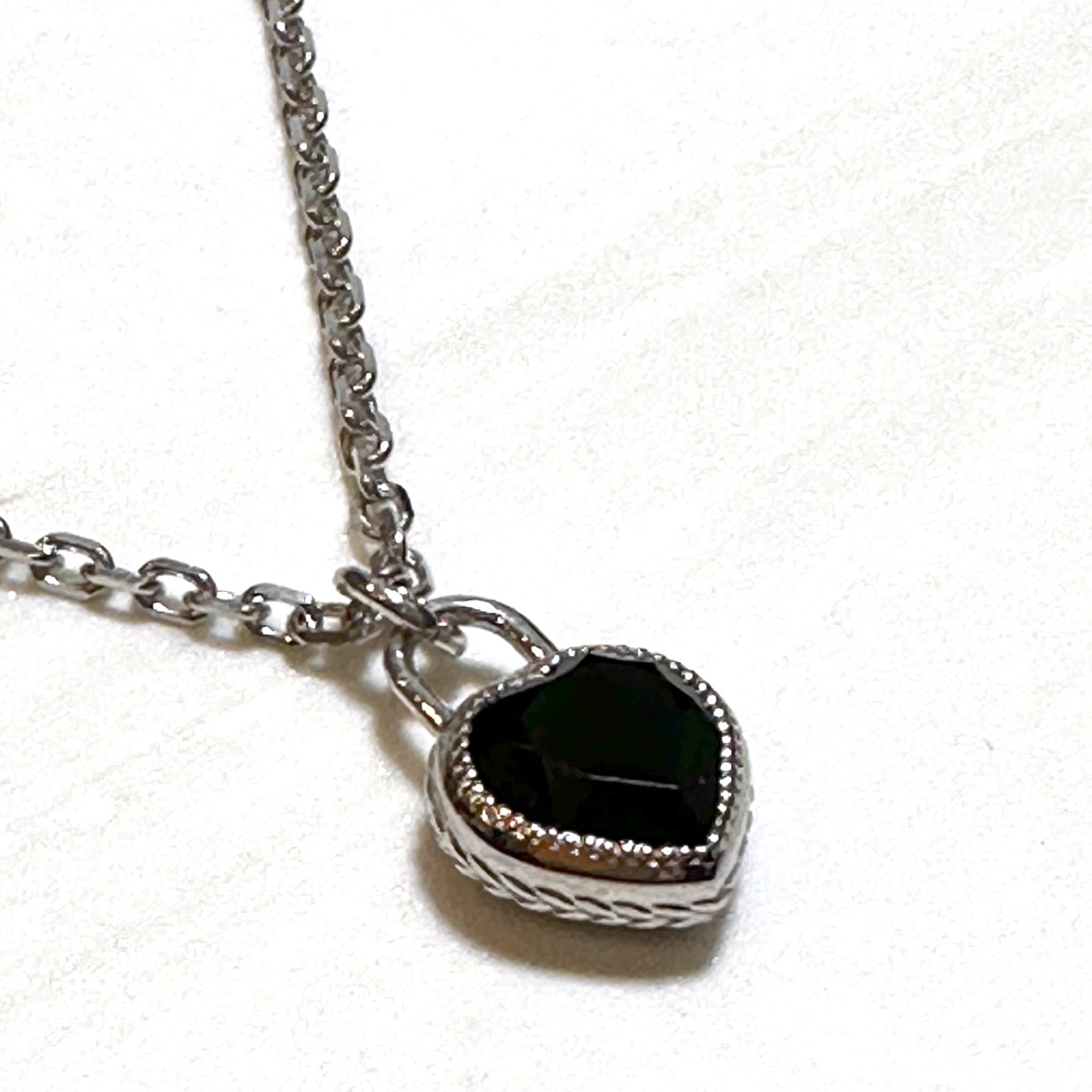 8㎜の大振りなハートカットのオニキスのネックレスはシンプルながらも洗練されたデザインが魅力的。ハート型の南京錠のようなデザインのペンダントトップと太めのチェーンの組み合わせが甘さを抑えてスタイリッシュな印象に。