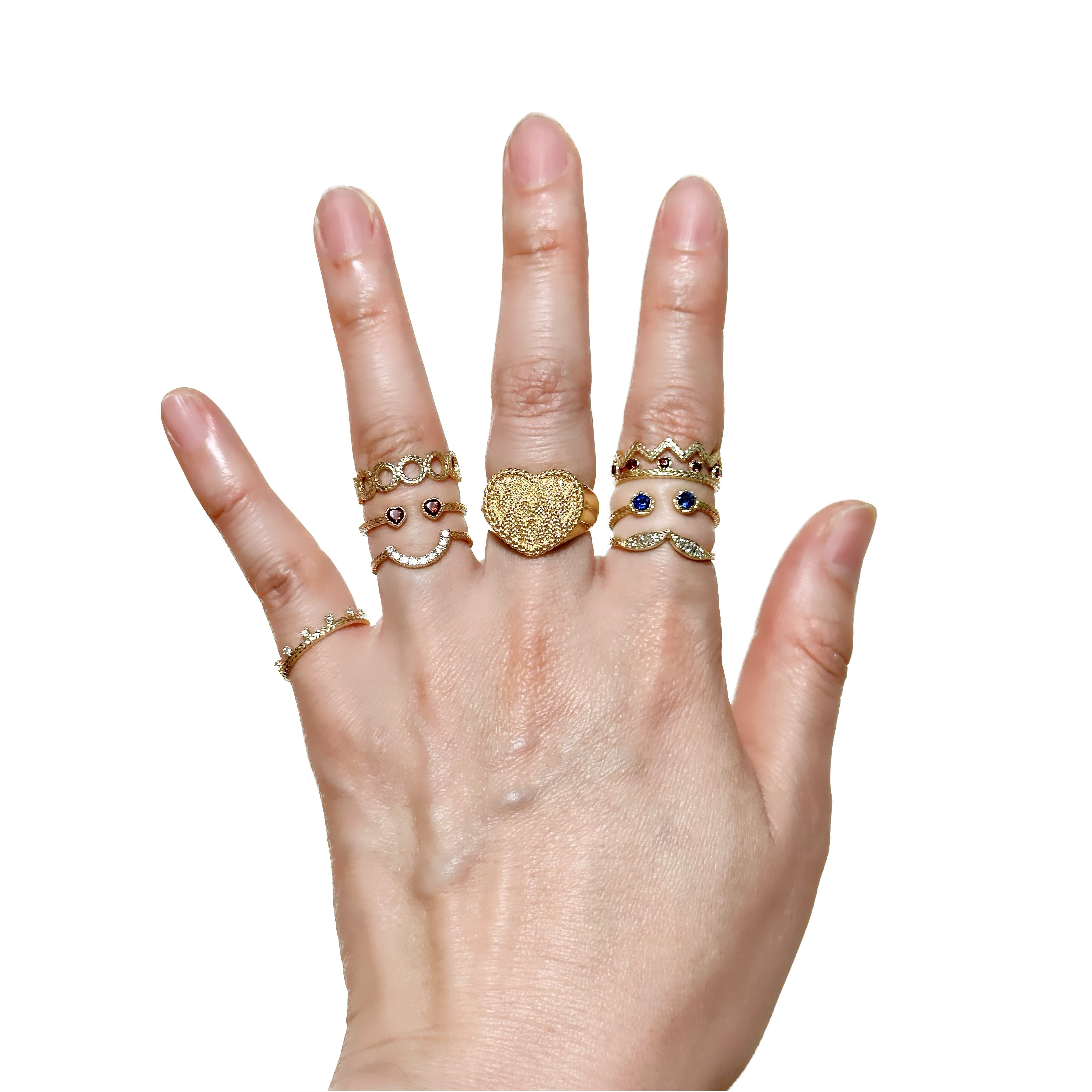 エレガントな輝きが魅力のK10 ダイヤモンド スマイル リング。指先にぴったりとフィットするデザインで、華やかさと上品さを同時に演出します。一つ一つ手作業で作り上げられた丁寧な仕上げは、品質へのこだわりを感じさせます。このリングには、厳選された上質なダイヤモンドがセットされており、高い耐久性と上質な輝きを持っています。ダイヤモンドの輝きとスマイルのデザインが絶妙にマッチした、特別なリングです。1本でも存在感がありますが、パールや天然石のオープンリングとの重ね付けで顔のように見えるスタイルもオススメです。