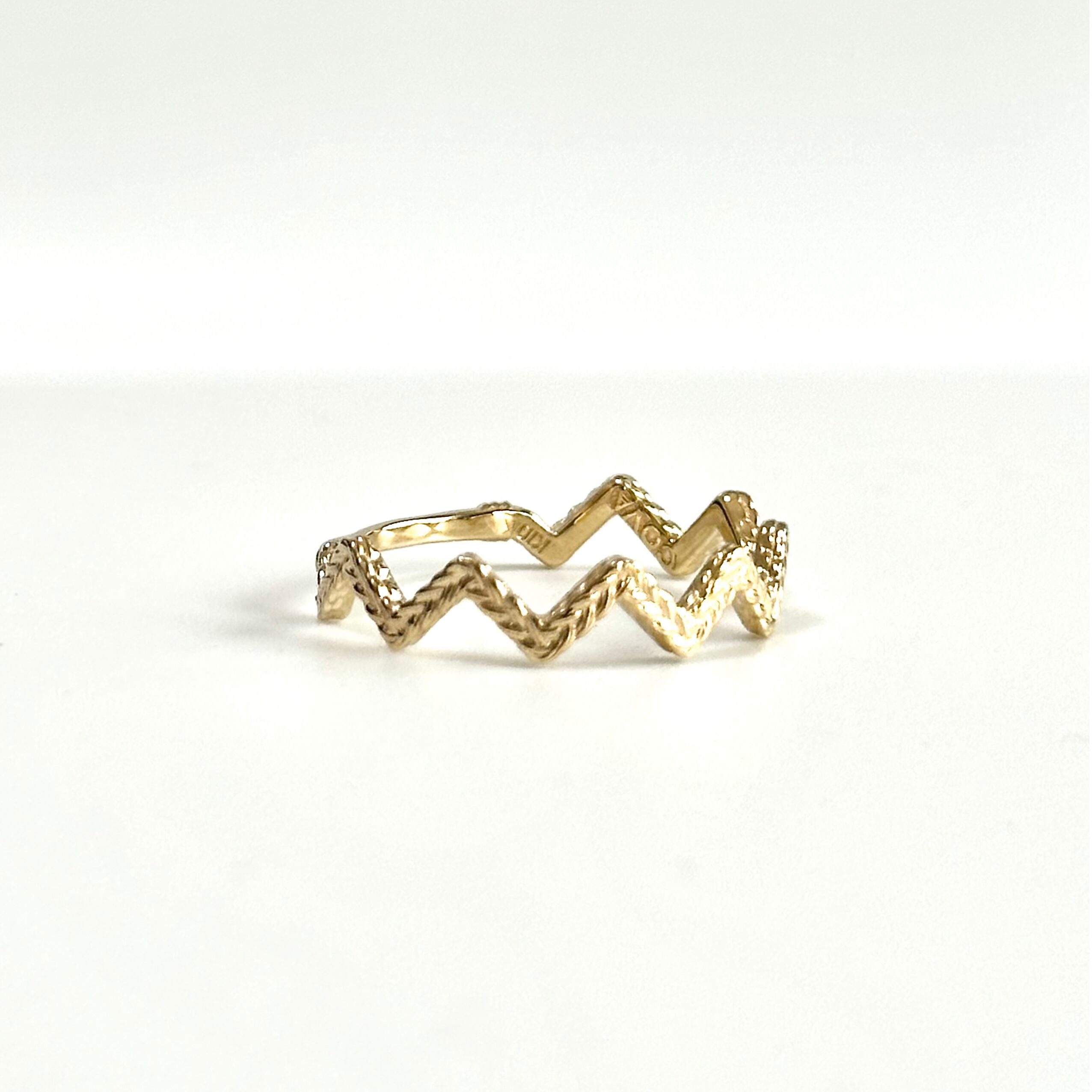 三つ編み模様のジグザグ型のデザインが目を引くリング。一つ一つ職人の手で丁寧に作られており、オンリーワンの存在感を放ちます。 指先を彩る存在でありながら、シンプルなデザインなので、どんなスタイルにも合わせやすく、普段使いから特別な日まで幅広く活躍してくれます。1本でも存在感がありますが、重ね付けもオススメです。