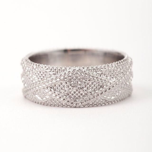 ケーブル編みニットの柄を表現したリング。ダイヤ柄の編地の柄が他にはなく、コーディネートのポイントに。セミマットなテクスチャーが手元を上品に輝かせてくれます。
