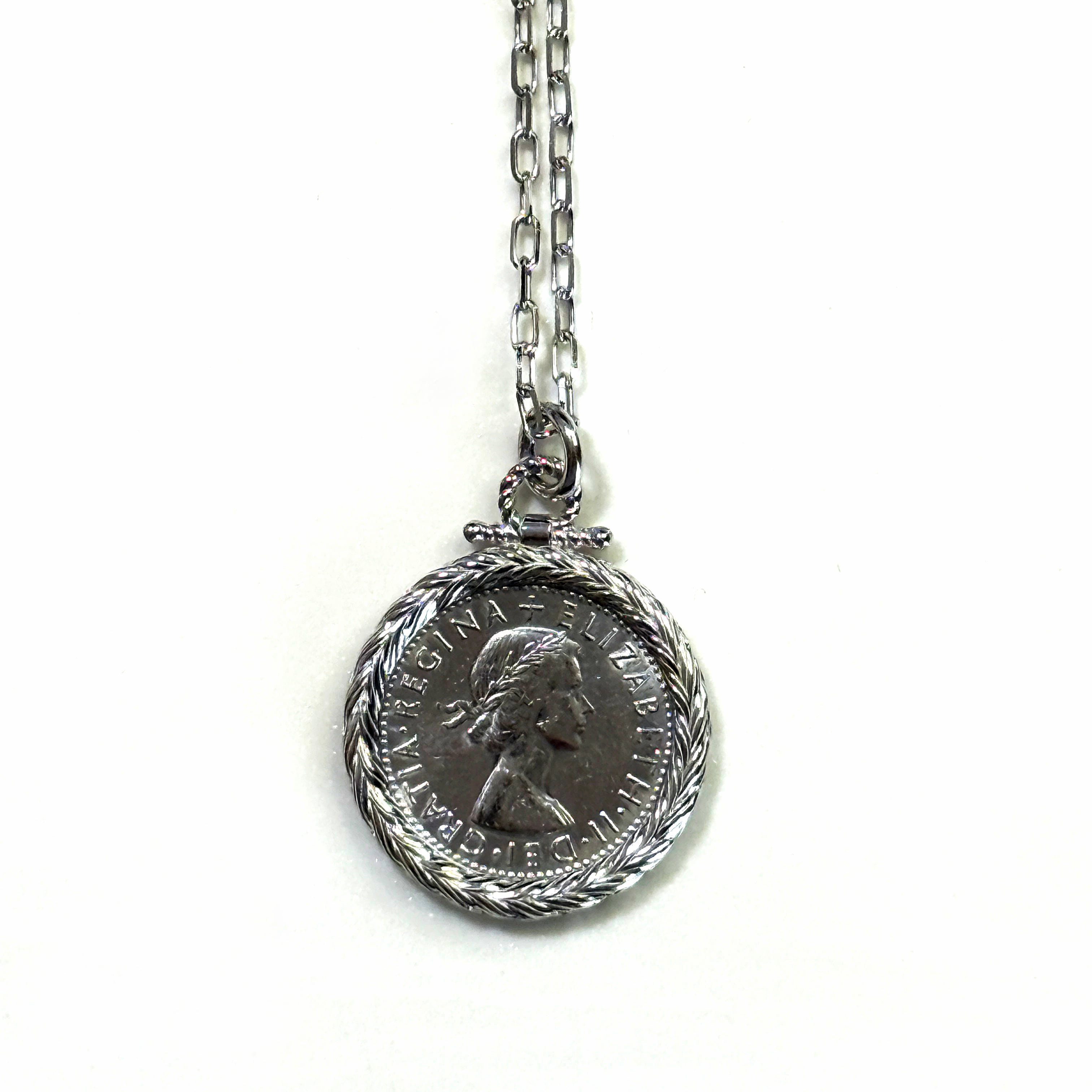 かつてイギリスで流通していた実物の6ペンス硬貨を使用したコインネックレス。表には気品あふれる若き日のエリザベス2世、裏にはイギリスを象徴する4つの植物が美しく刻まれた、歴史を感じさせるデザインが魅力です。