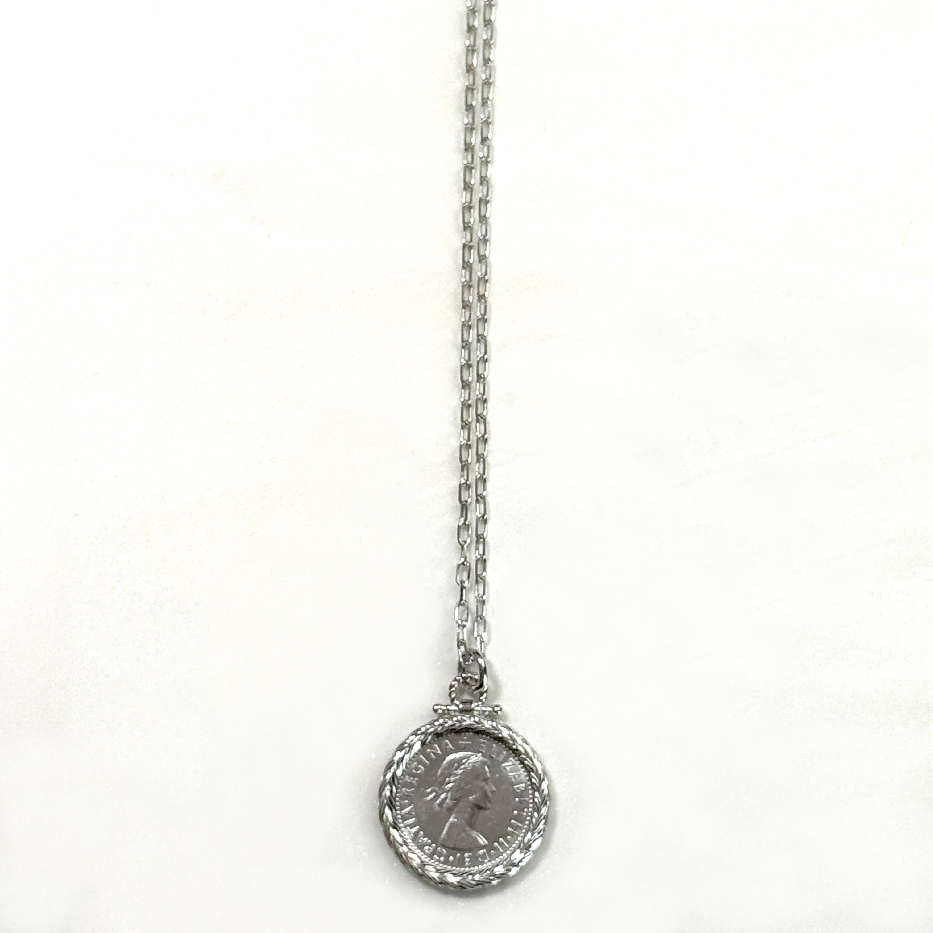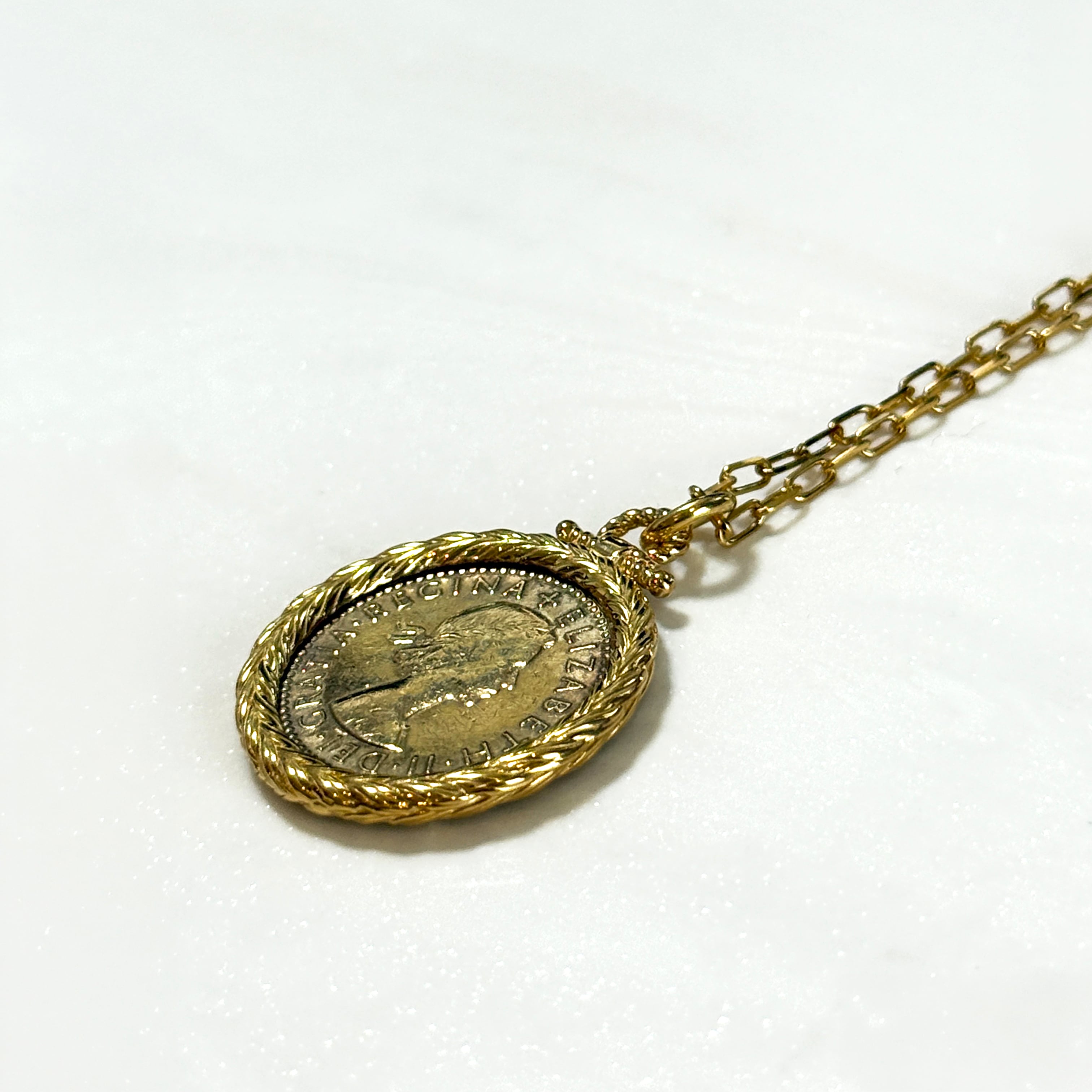 かつてイギリスで流通していた実物の6ペンス硬貨を使用したコインネックレス。表には気品あふれる若き日のエリザベス2世、裏にはイギリスを象徴する4つの植物が美しく刻まれた、歴史を感じさせるデザインが魅力です。