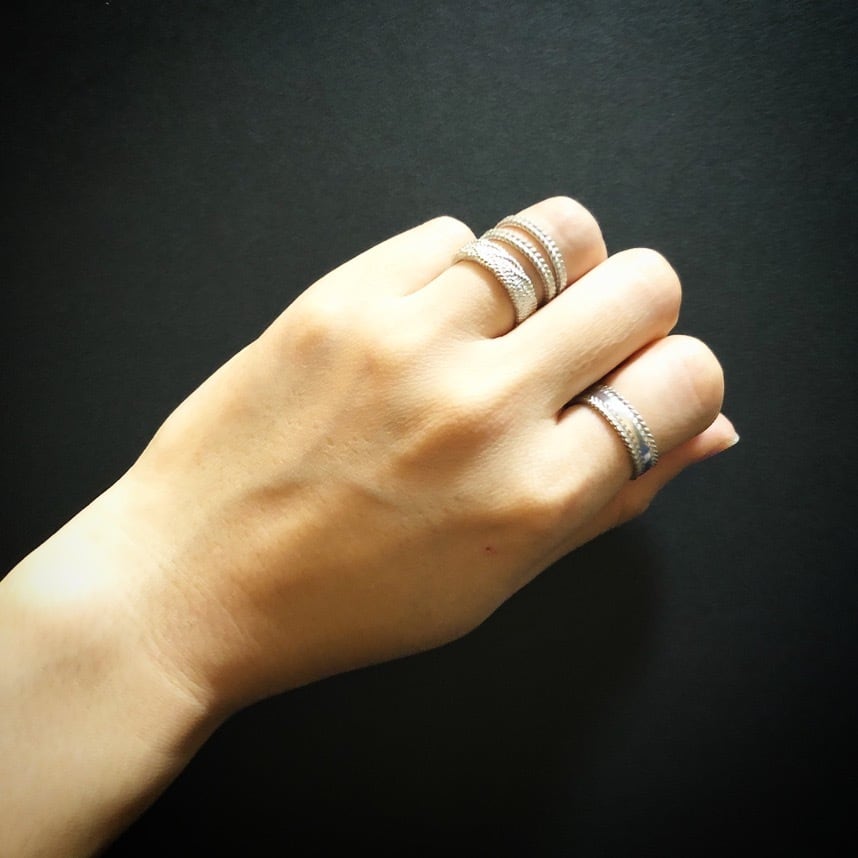 1つでも存在感のあるリングですが、細いリングとの重ね付けもオススメです。
