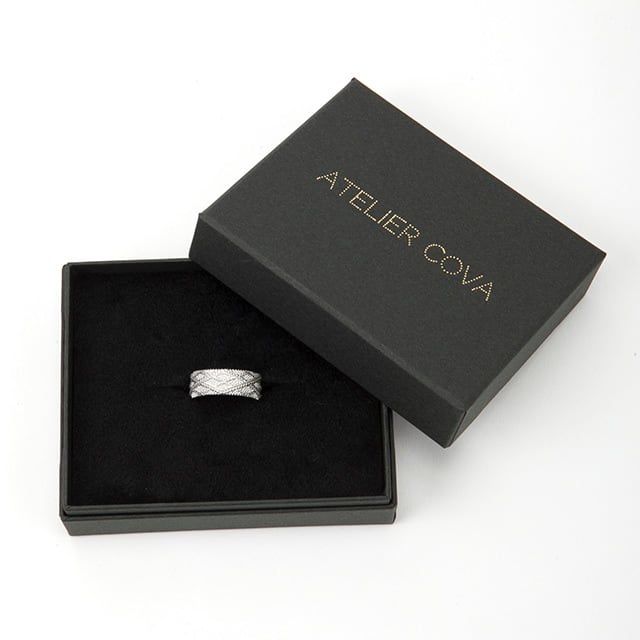 ケーブル編みニットの柄を表現したリング。自身で3D CADデータを作成し、6mmの幅に緻密な編み地を表現しています。光沢を出す為に磨き過ぎると柄が消えてしまう為、マットな質感に少しの光沢を出すよう、仕上げにもこだわっています。