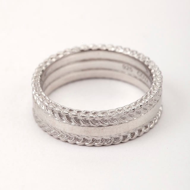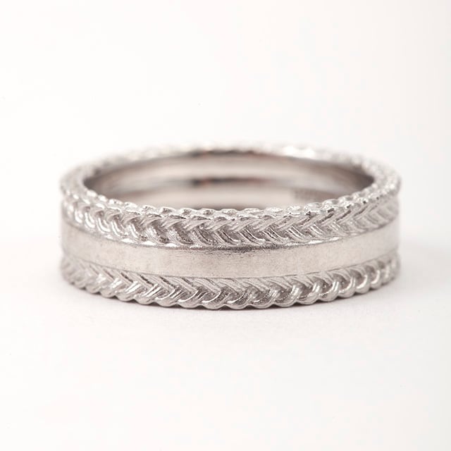 三つ編みの柄のリングの重ね付けを表現したリング。自身で3D CADデータを作成し、2mmの幅に緻密な編み地を表現しています。側面はもちろんですが、上下の面も三つ編み柄になっています。光沢を出す為に磨き過ぎると柄が消えてしまう為、マットな質感に少しの光沢を出すよう、仕上げにもこだわっています。