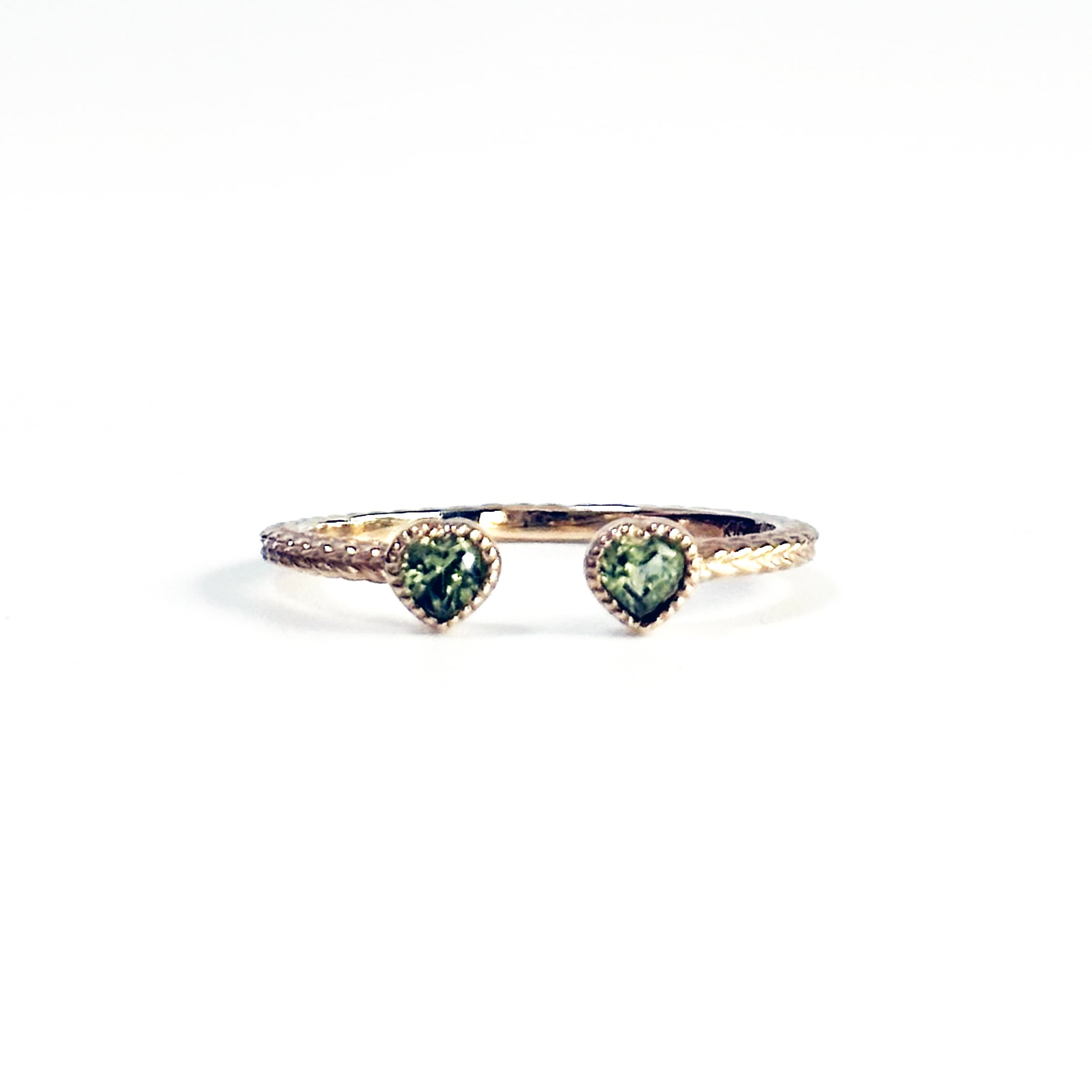 ハート型のペリドットのオープンリング。フロントが開いる事で±1号の調整が可能ですので、お好みの指に付け替えが可能です。3㎜と小さいながらもハートの形が美しく見えるように「ミル留め」というドット型の無数の爪でハートを囲むように石を留めています。ハートのデザインが愛らしく、1本でも存在感がありますが、重ね付けもオススメなリングです。